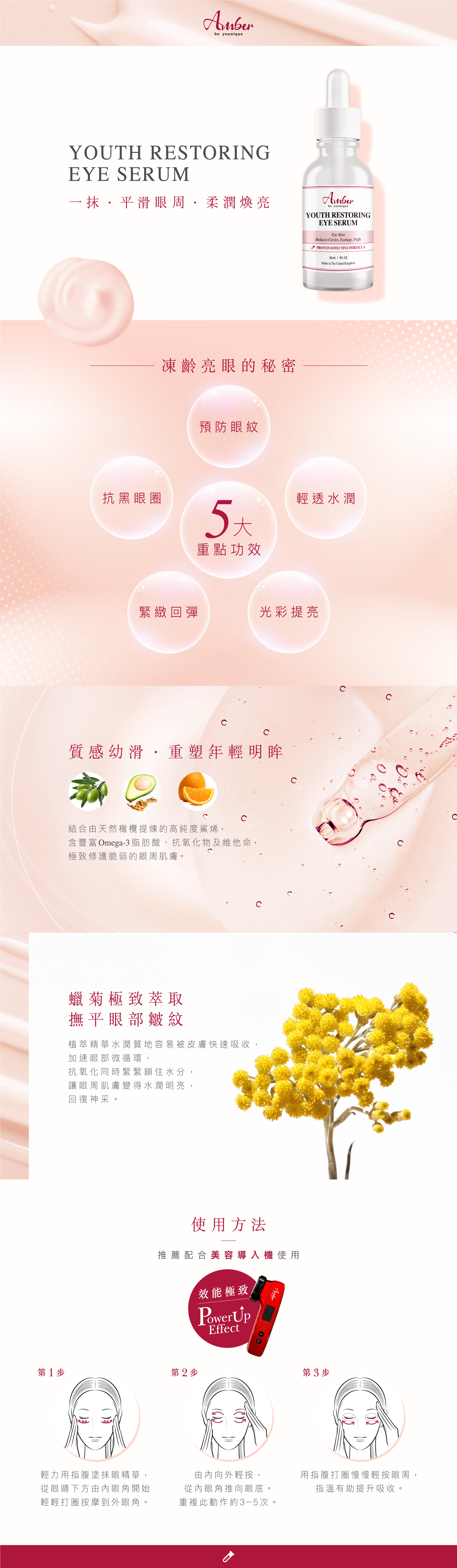 Amber Youth Restoring Eye Serum 眼部精華以雙重核心成分呵護眼周,天然橄欖萃取的高純度鯊烯,深入滋養並強健眼部肌膚。加上蠟菊植萃精華的高效抗氧化與保濕作用,能夠提升肌膚彈性與光澤感。有效改善眼袋、黑眼圈及浮腫,令雙眸更顯神采奕奕。